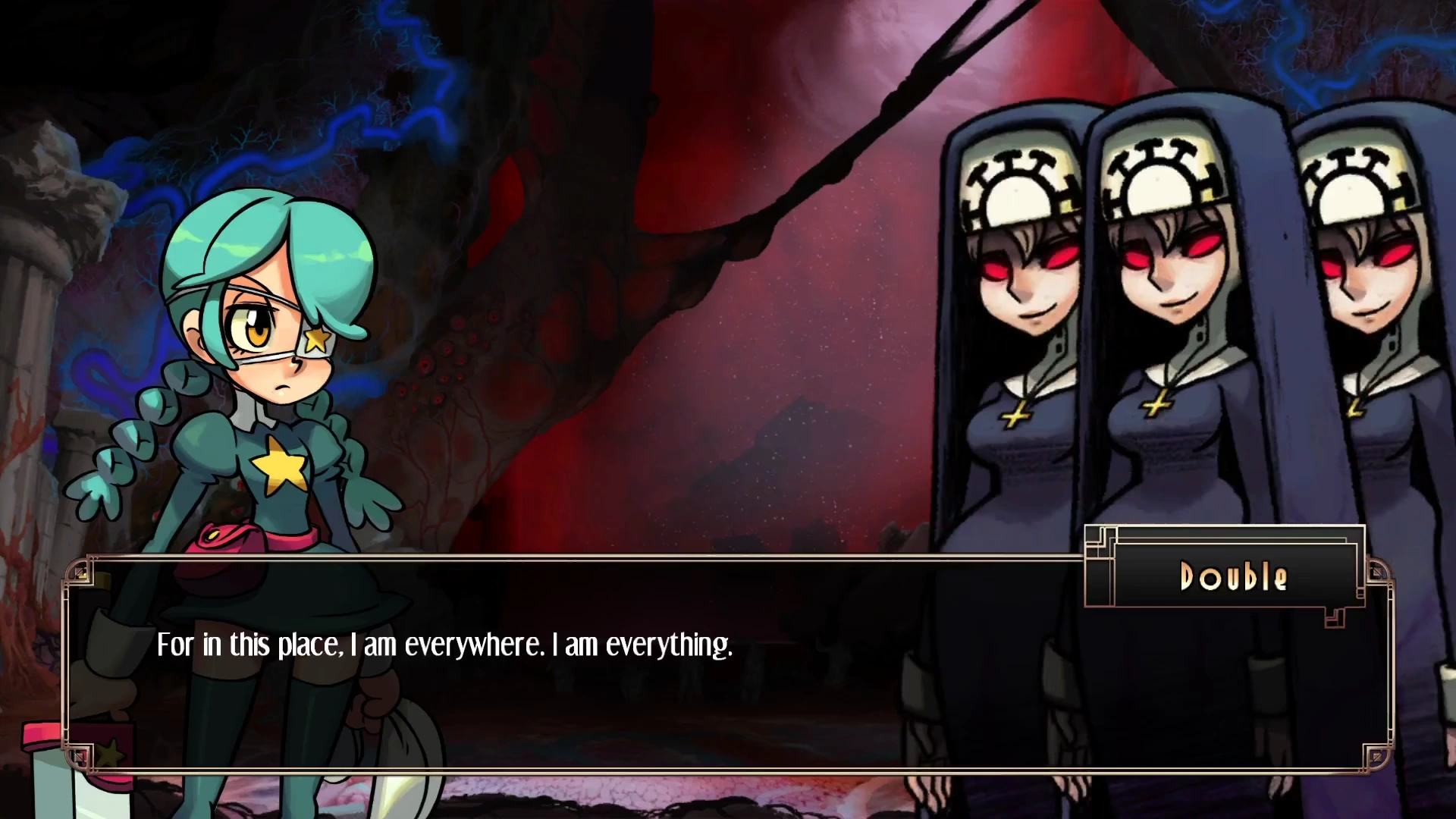 How about Double? Well, that's simpler. You just have to compromise/destroy Gehenna. There's only really one time where Double has been permanently put down, and that's in Eliza's Story Mode. Eliza has the ability to empower herself and manipulate blood, whether it's hers or from other sources. Once she figured that there was blood in Gehenna, Eliza basically used all of it to beat and kill Double. She even notes that "it's time for her to join her daughters", as she was also the one who killed Aeon and Venus long ago. Yes, that means that the time Squigly incinerated Double's body as well as Annie bisecting her in two? Yeah, she didn't die from that. This is supported by the fact that Double can collapse Gehenna whenever she wants and survive, meaning that to truly kill Double, you must mess with and destroy Gehenna.